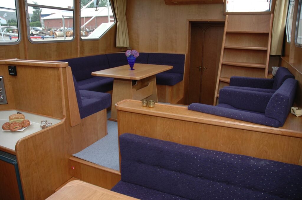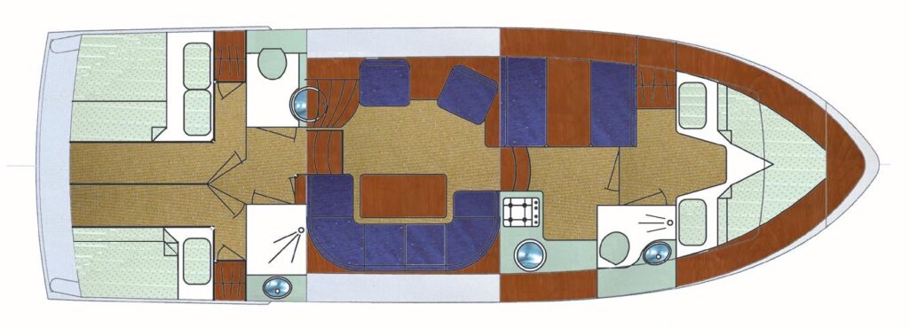 Die Veha Euroline 118 MY verfügt über 2 Achterkajüten mit Doppelbett bzw. Etagenbetten und einer Vorderkajüte mit zwei Einzelbetten. Weiterhin ist die Dinette zum Doppelbett umbaubar. Jede Kabine ist liebevoll eingerichtet und bietet ausreichend Stauraum sowie bequeme Schalfmöglichkeiten.